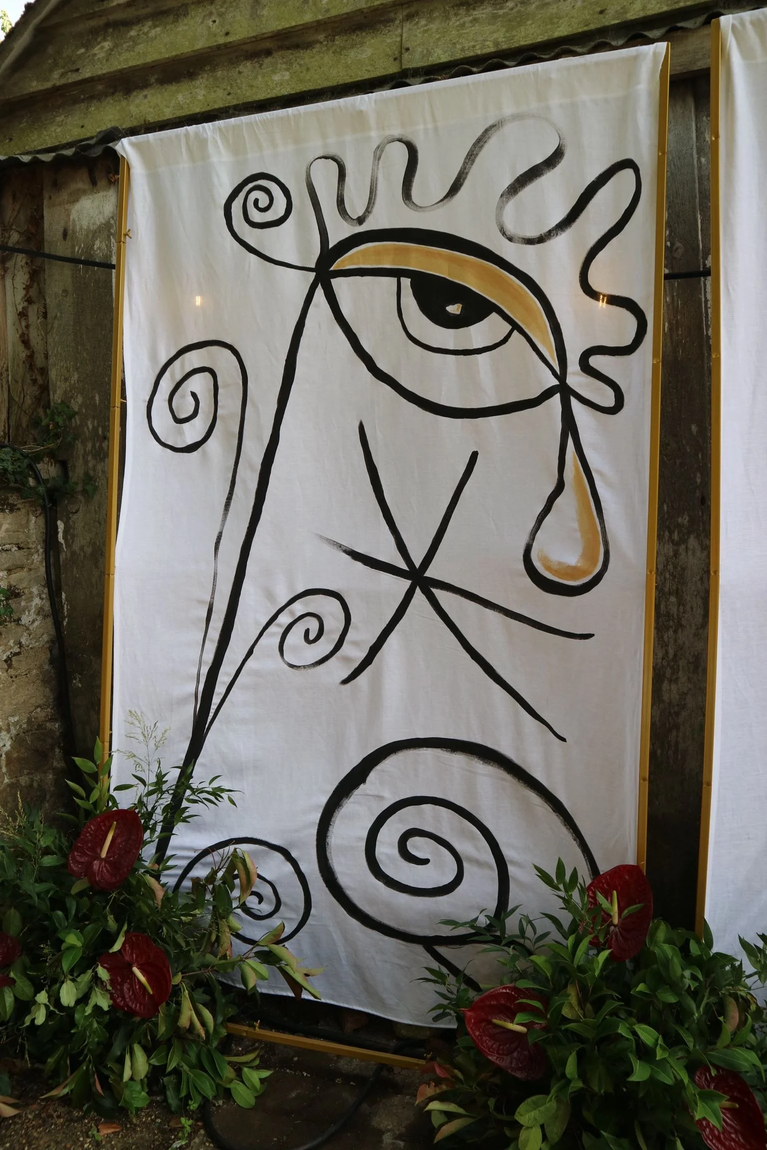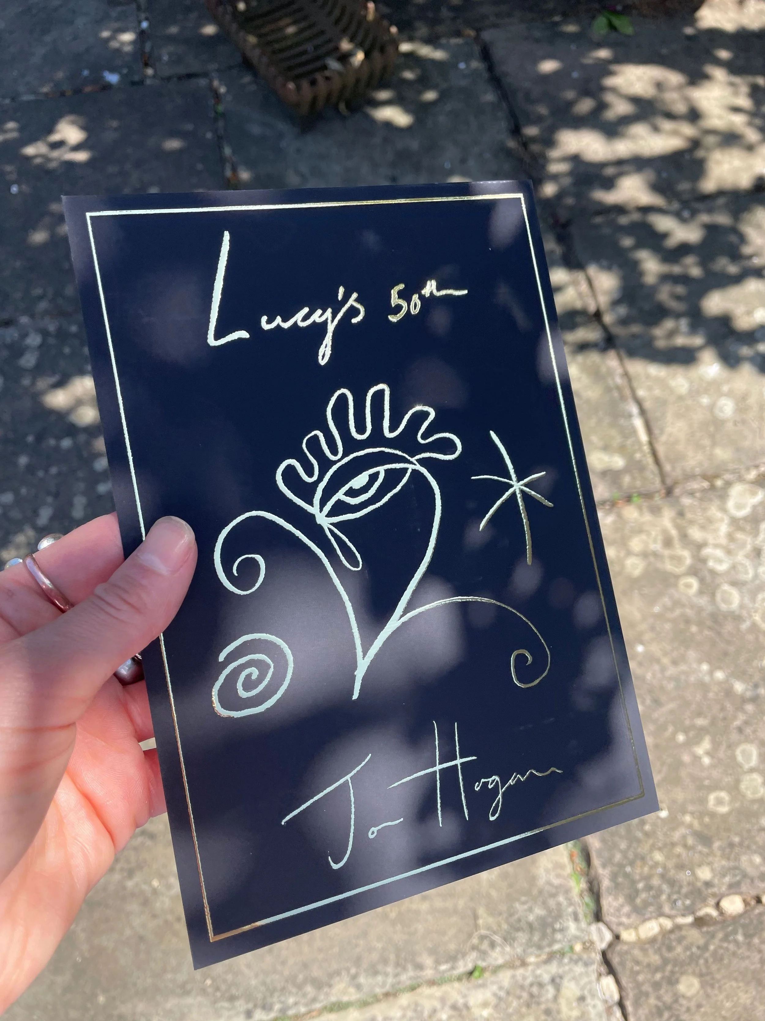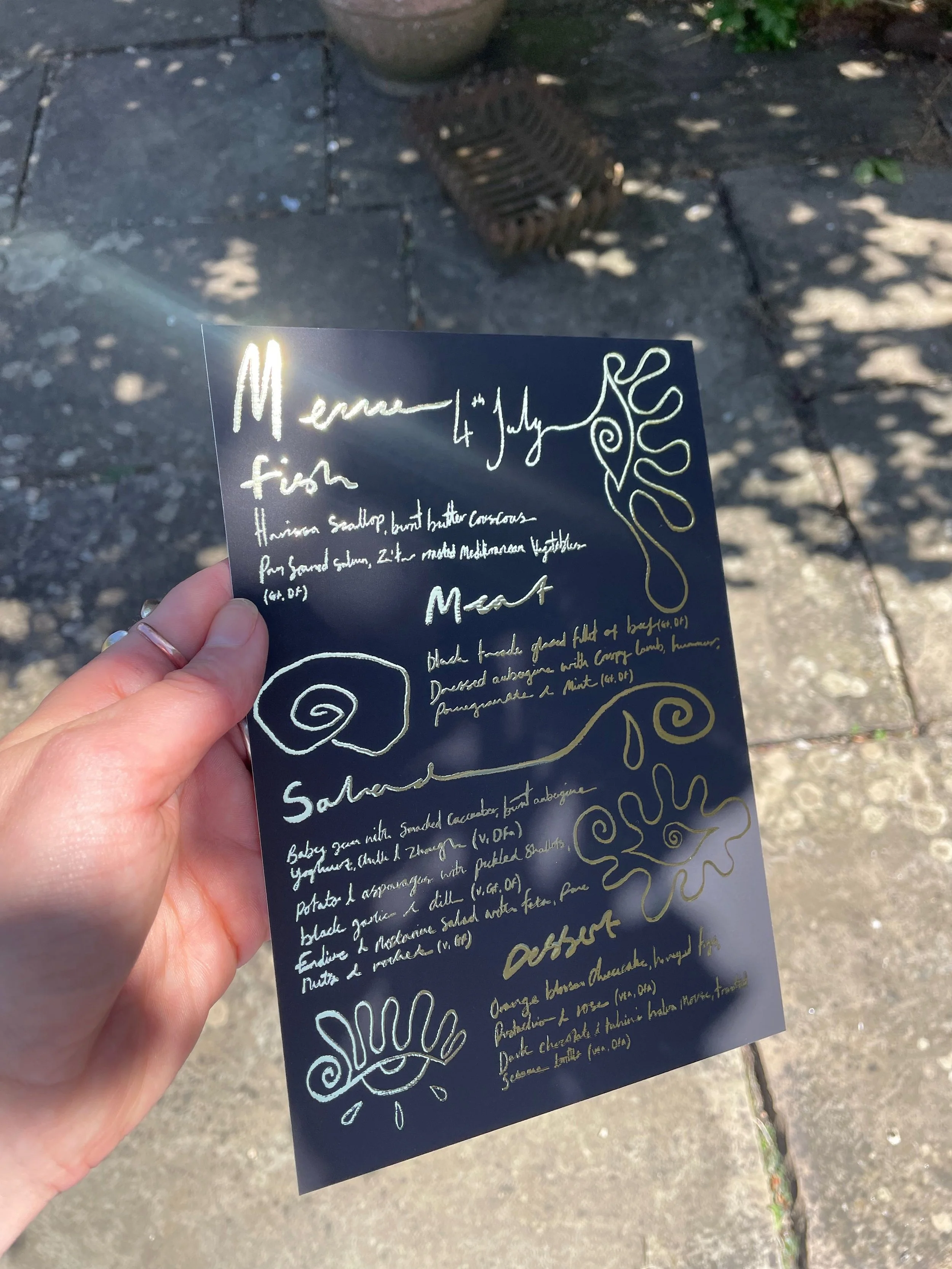 Handprinted fabrics and a bespoke illustration style with bold outlines ran through the menus and signage, tying the entire visual identity together. The main menu doubled as a table name - gold-stamped and printed on black card - creating a striking focal point and adding a true wow factor to the tablescape.